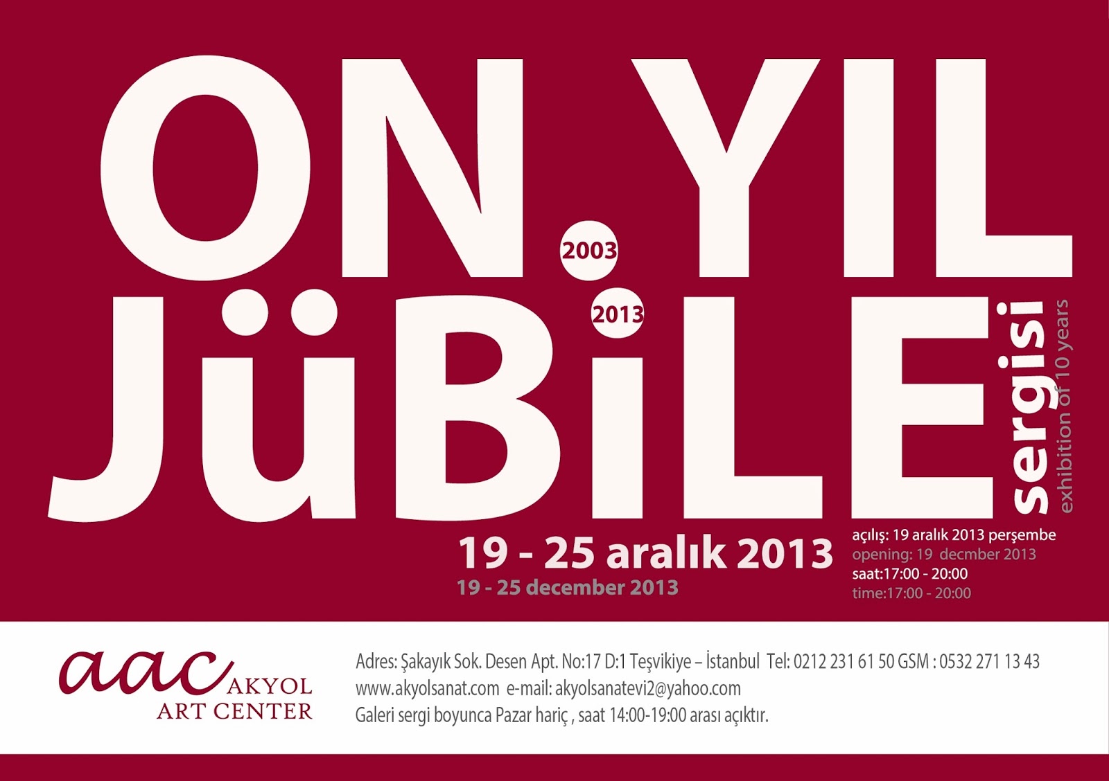 Akyol Sanat Merkezi; 10.yıl JÜBİLE’sini, 19 – 25 Aralık 2013 tarihleri arasında yapıyor. Sanat hayatında 10.yılını dolduran Akyol Sanat Merkezi, bu etkinliği 19 Aralık 2013 tarihinde tüm sanatçı dostları ve sanatseverlerle birlikte kutluyor.
